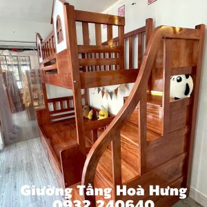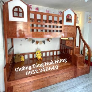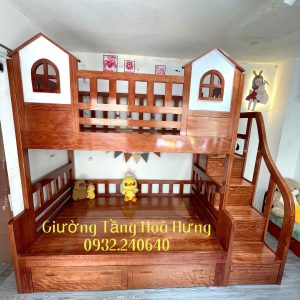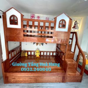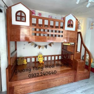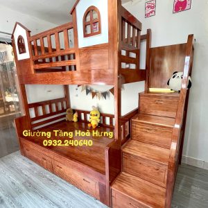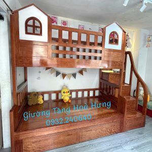 Giường tầng cầu thang hộp gỗ Xoan Đào, có thành bảo vệ cao 76cm hình 2 ngôi nhà