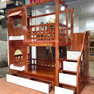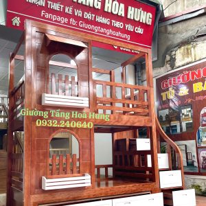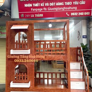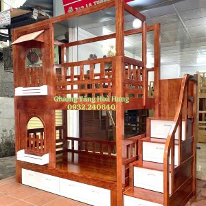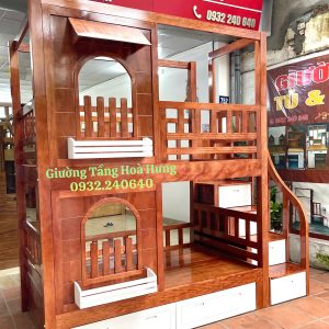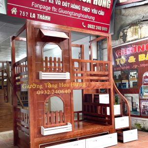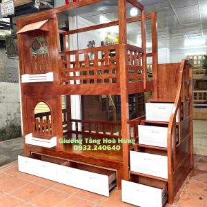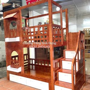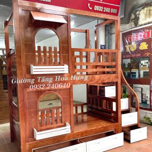 Giường tầng cầu thang hộp gỗ Sồi, có thành bảo vệ cao 76cm hình 2 ngôi nhà