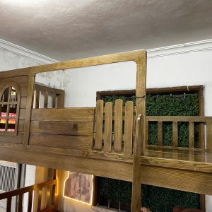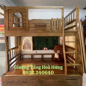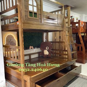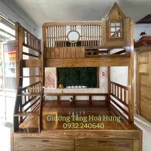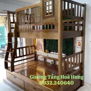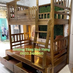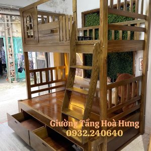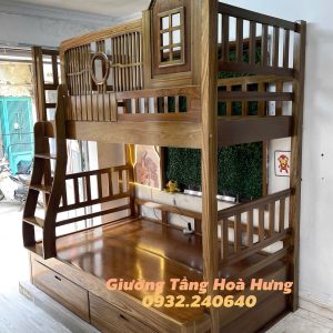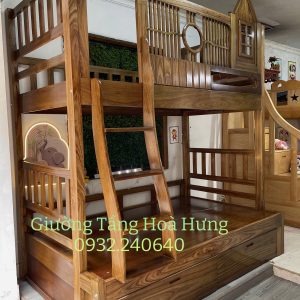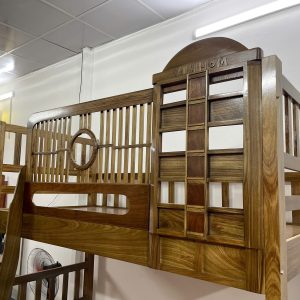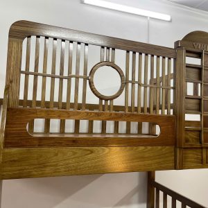Giường tầng cầu thang treo gỗ Hương Xám, có thành bảo vệ cao 76cm