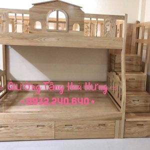 Giường tầng gỗ xoan đào cầu thang hộp, chân thẳng