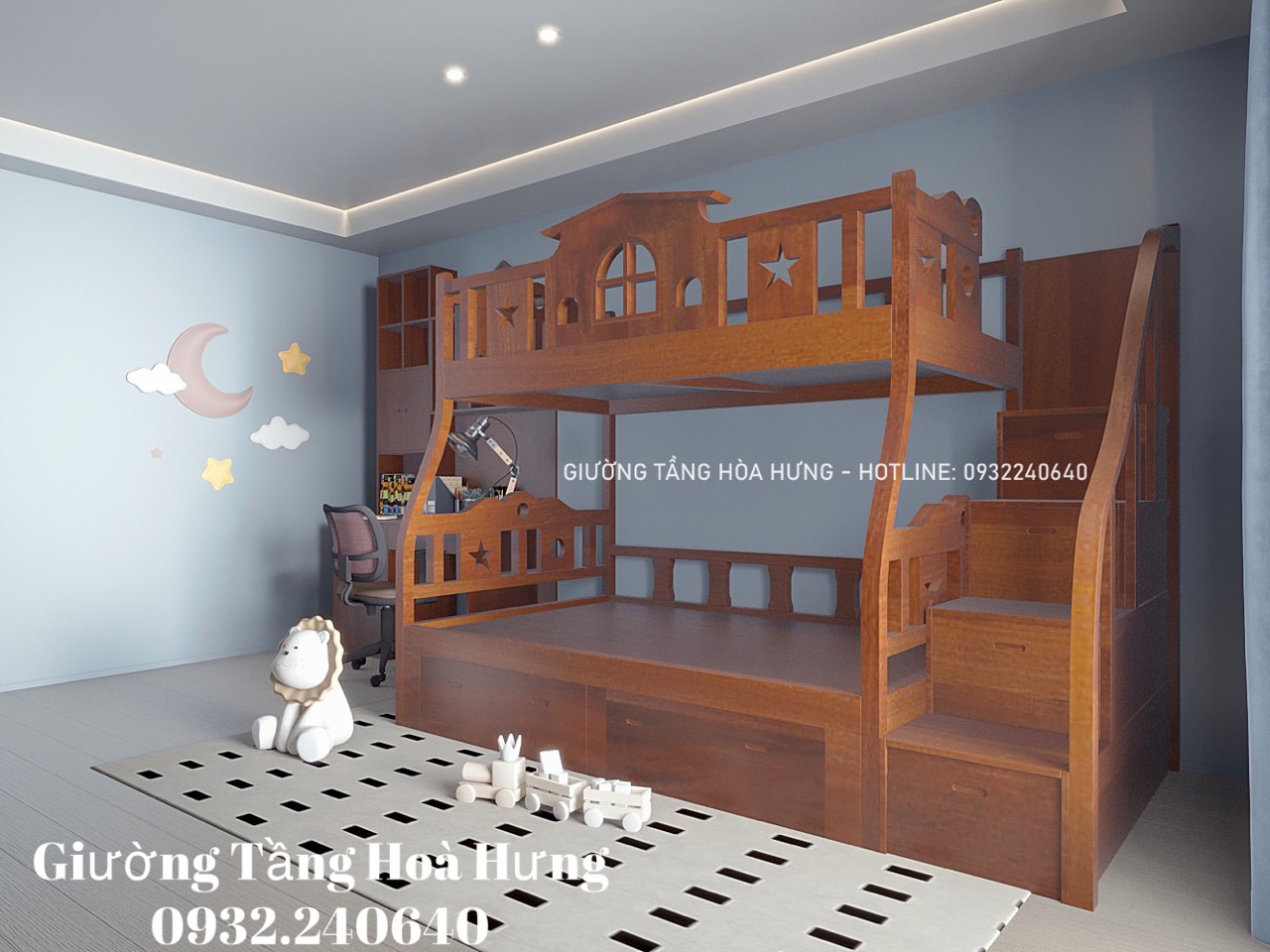 Giường Tầng Cho Bé 1m2-1m gỗ Xoan đào – Thang Hộp – Chân cong