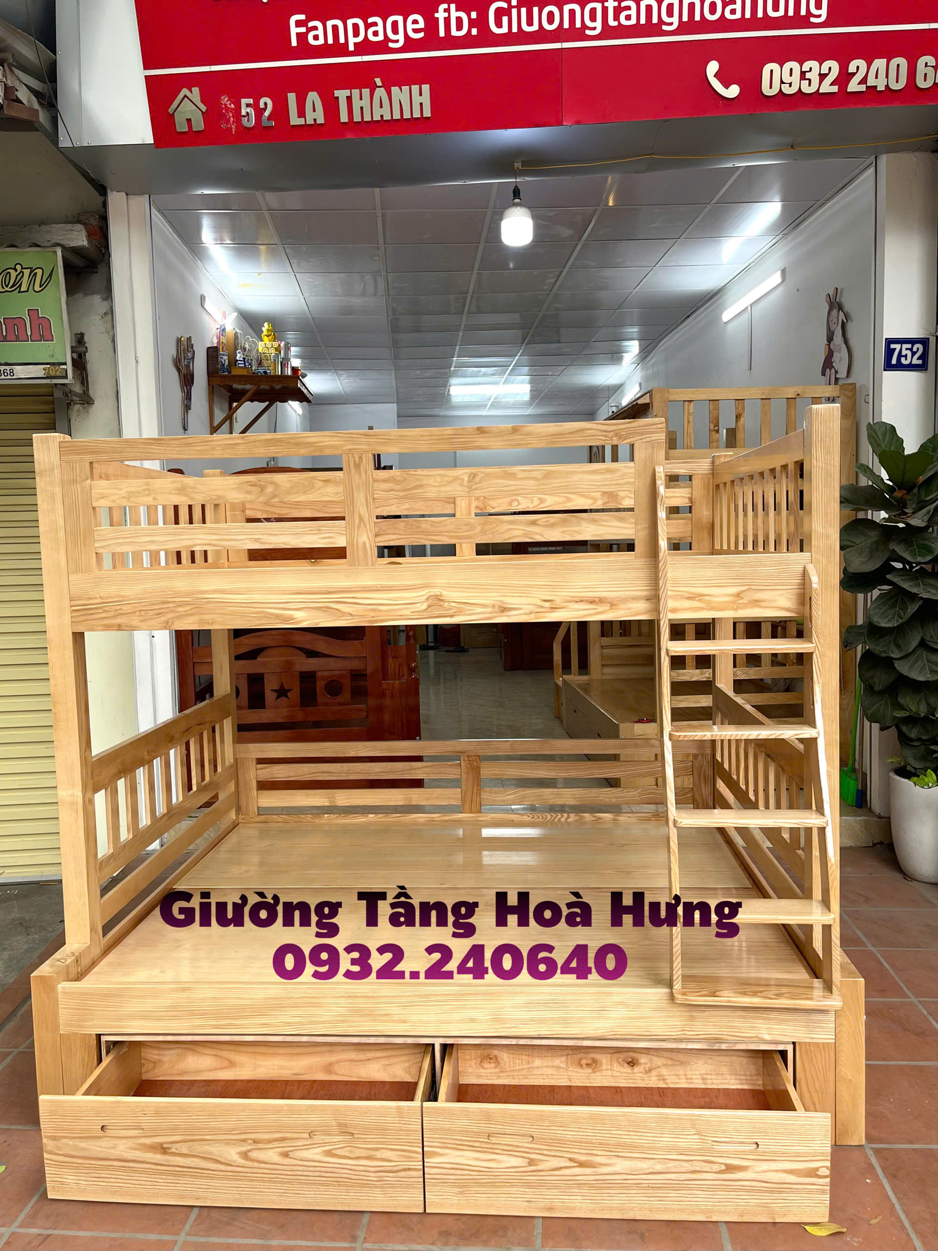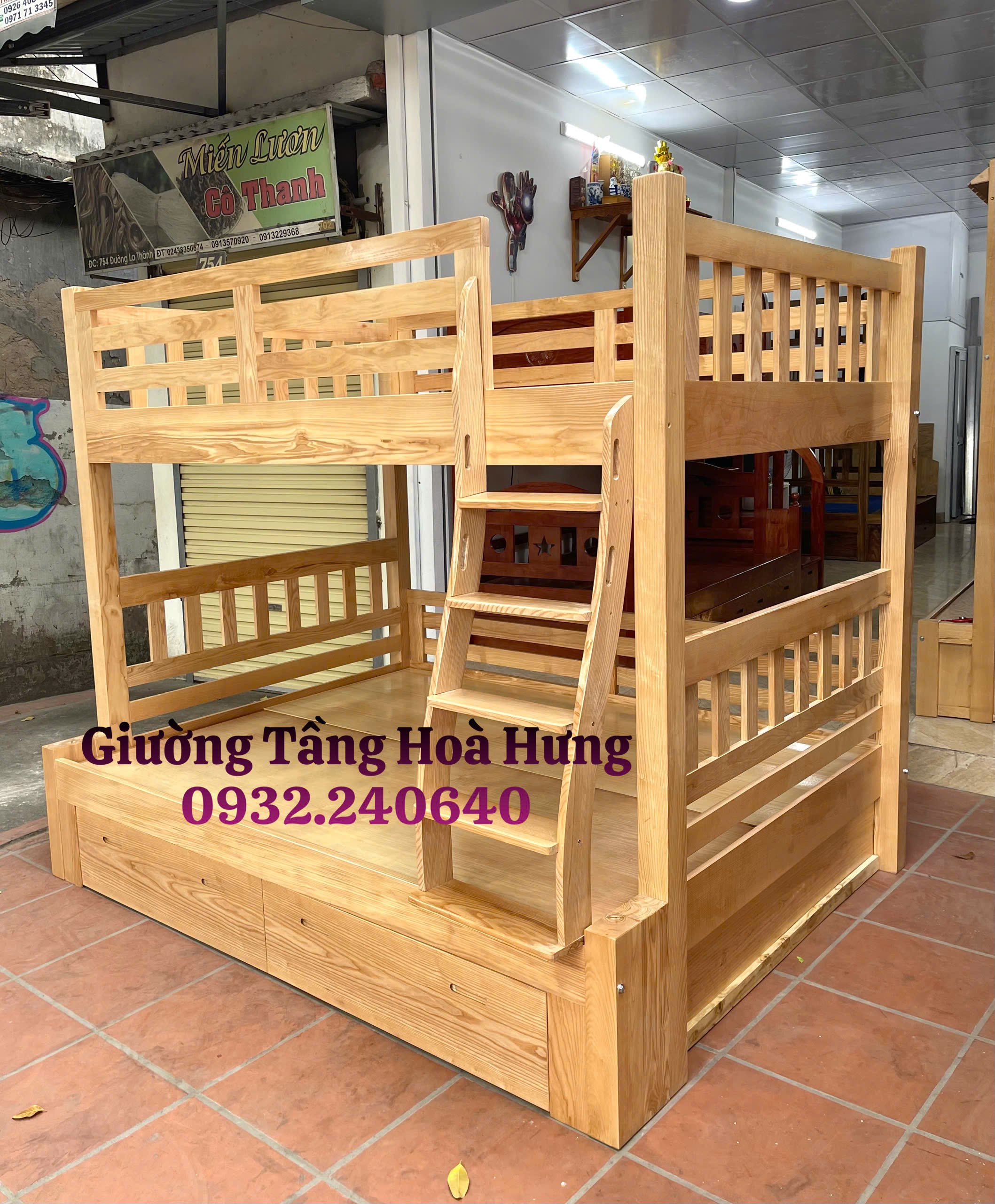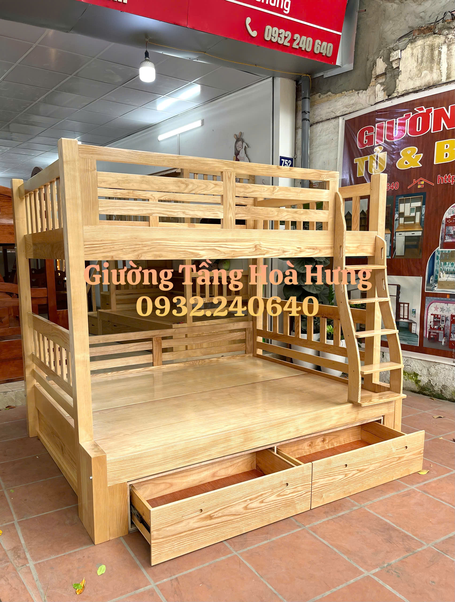 Giường tầng cầu thang treo, gỗ sồi ,cỡ to: