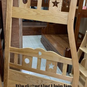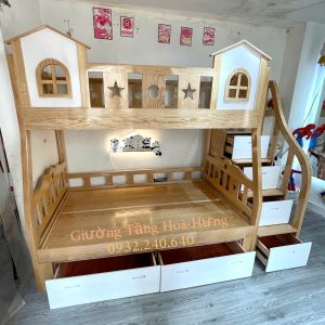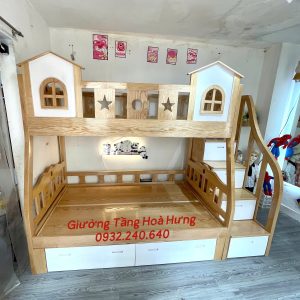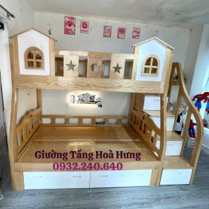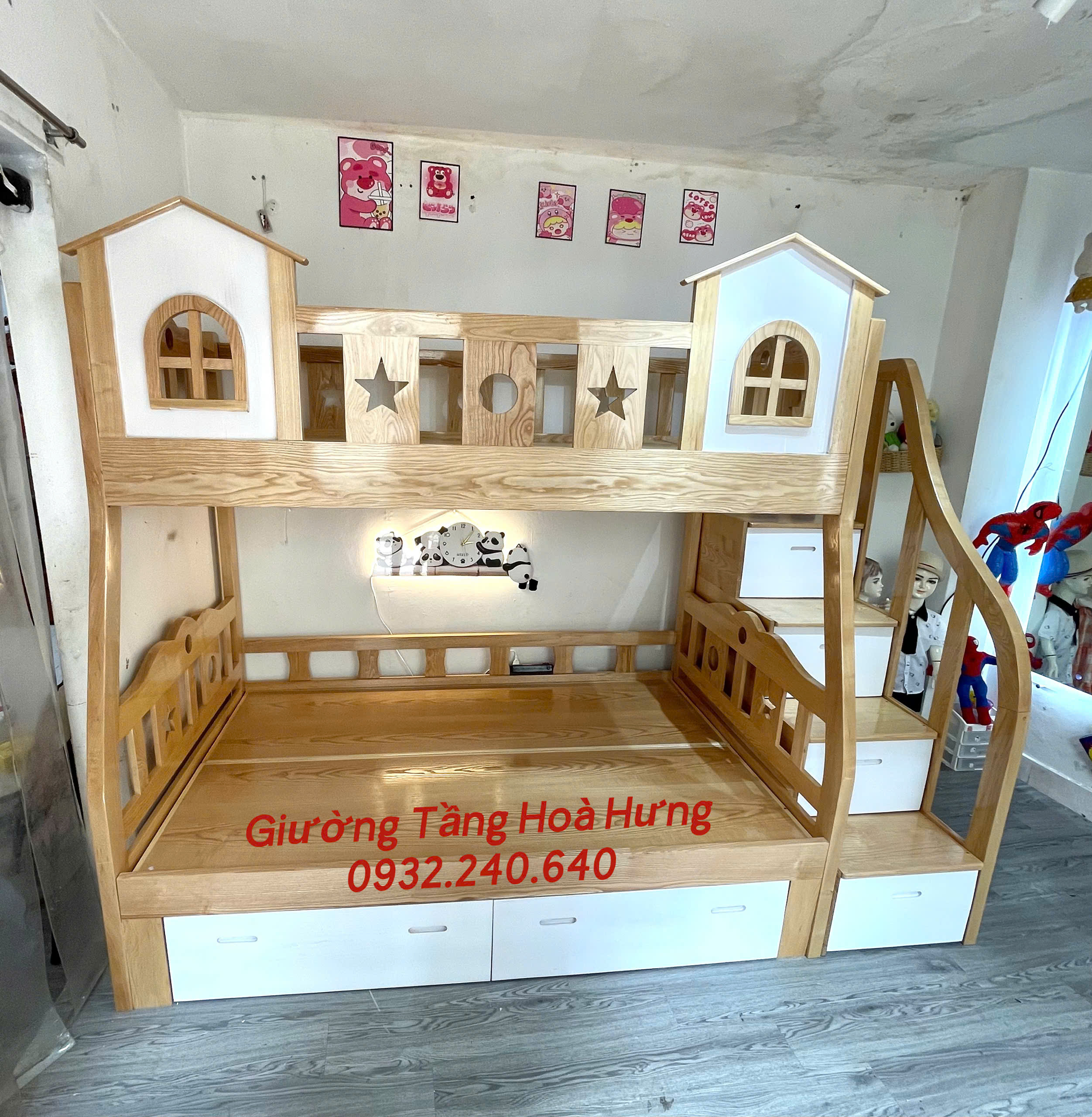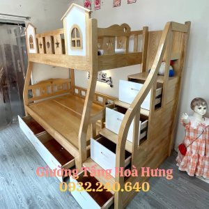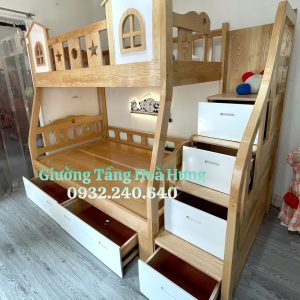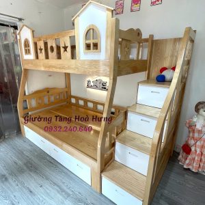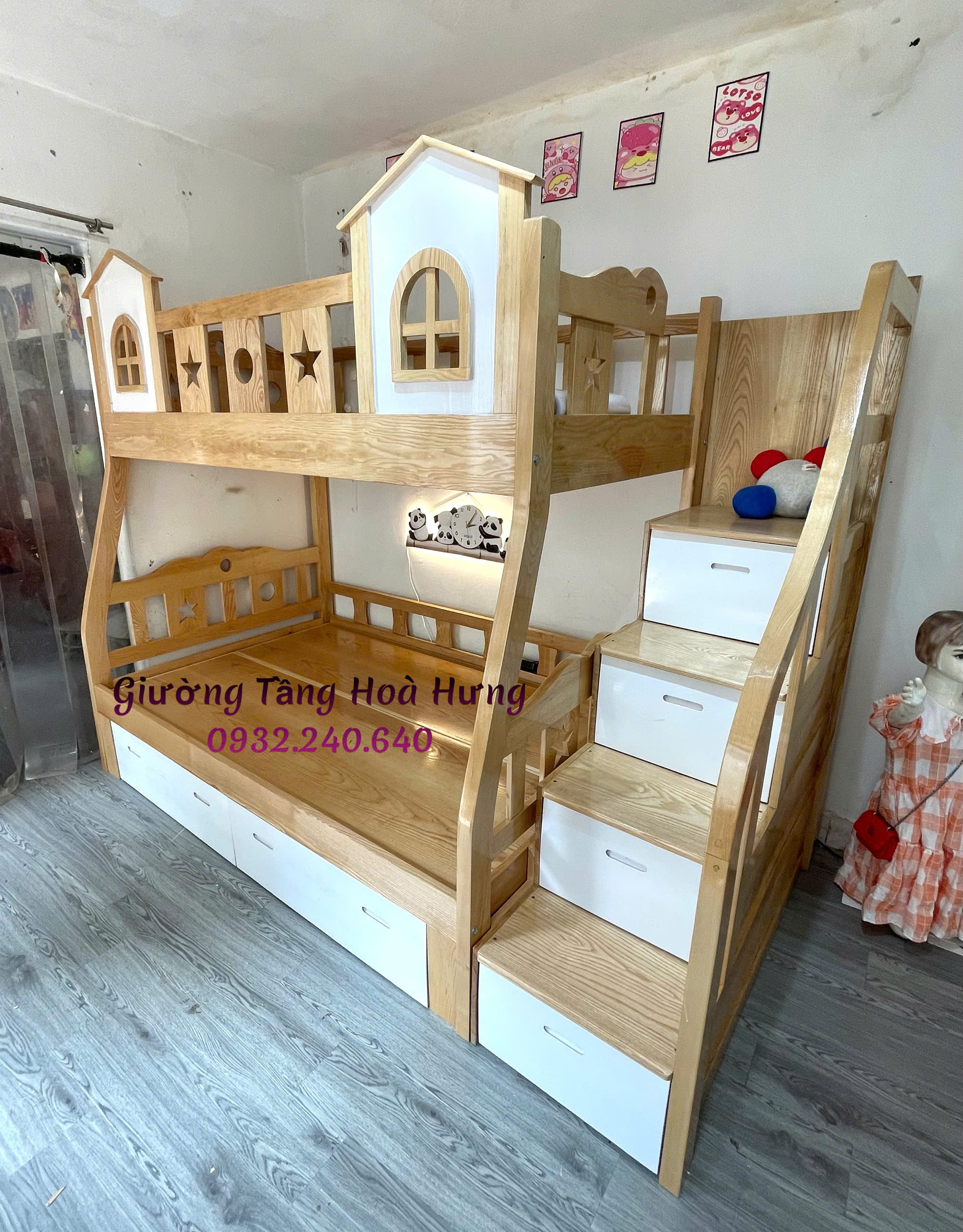 Giường tầng cầu thang hộp, gỗ sồi, sơn phối trắng: